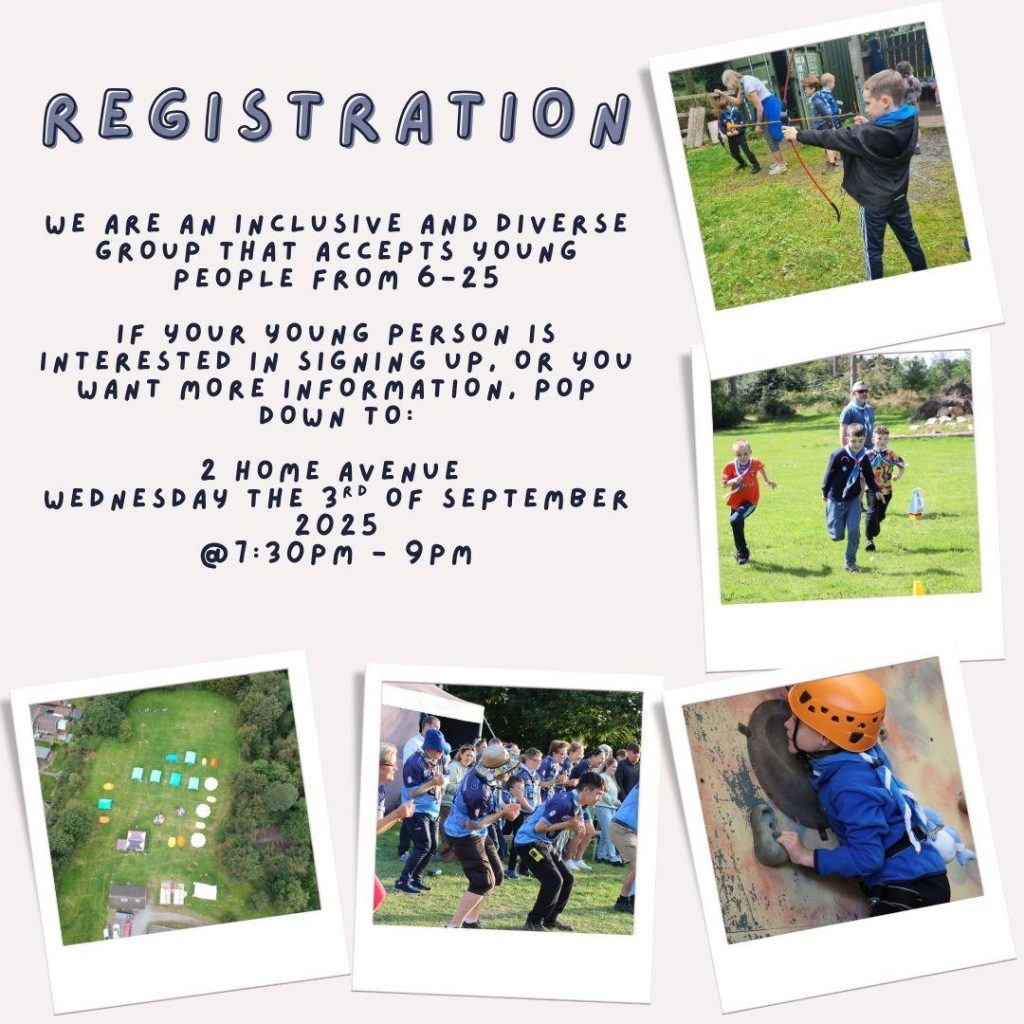 September marks the beginning of the 2025-26 Scout year and, so, we turn our attention to registration of members. All our existing members are required to re-register each year at the start of September. In addition, we are inviting prospective new members to come along, meet the leaders, hear about the Scouts and register your interest to join on our registration evening.